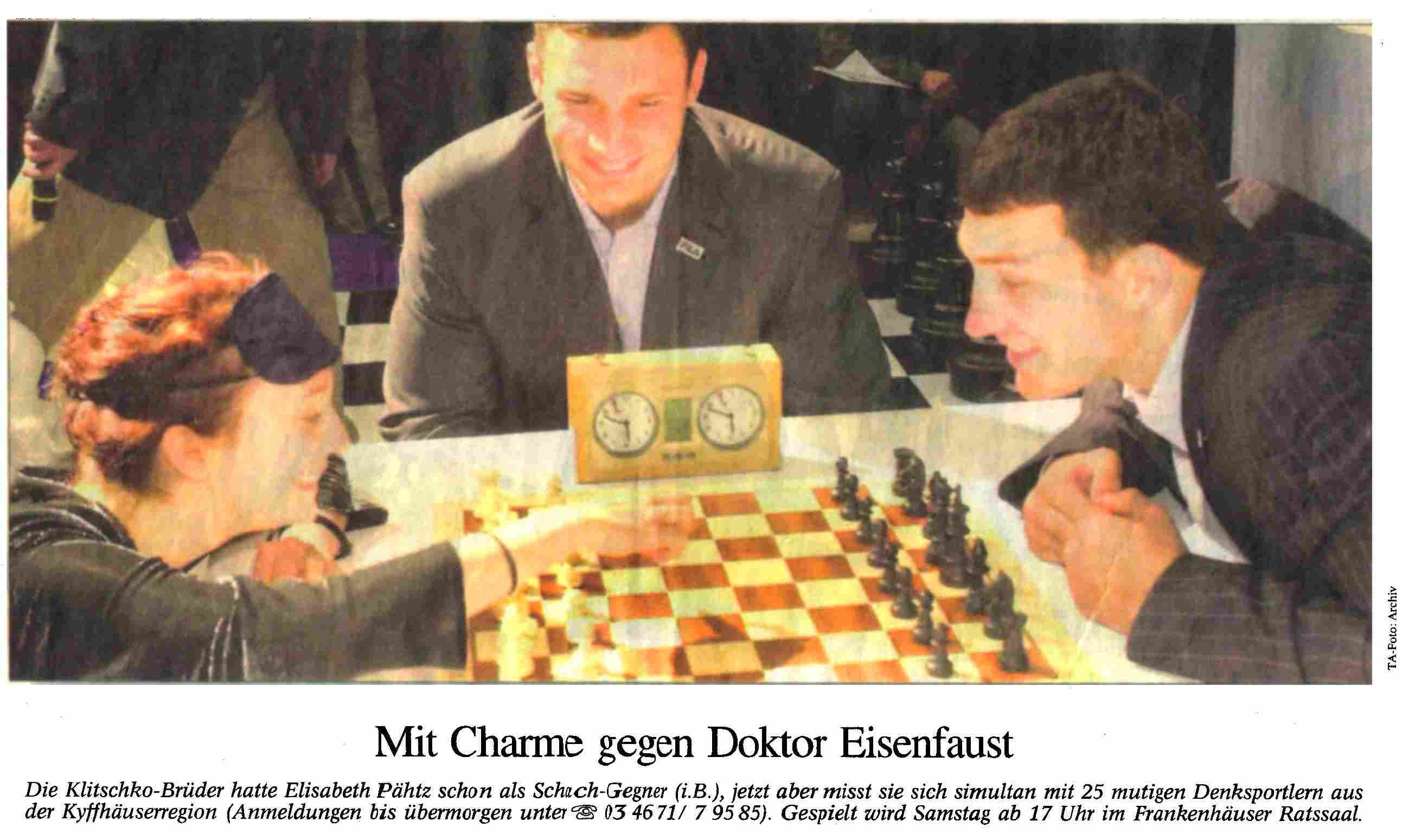 + Herausforderer gesucht ... + 25 gegen Elisabeth... + Mit Charme gegen Doktor Eisenfaust... + An 27 Brettern gleichzeitig... +Bretter-Hilfe und Hallo des Präsidenten.. + Hochleistungs- denkerin... + Vier schafften Remis... + |